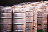 Zapas beczek piwa stalowego na paletach drewnianych. Wiele beczek piwa w fabryce piwa.