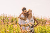 Młody mężczyzna przytula i całuje swoją dziewczynę w terenie