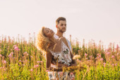 Młody mężczyzna przytula i całuje swoją dziewczynę w terenie