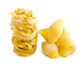 Makaronowe gniazdo. Niegotowane gniazdo makaronu tagliatelle izolowane na białym