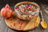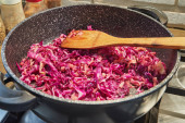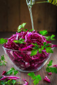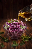Sałatka z czerwonej kapusty z pietruszką i oliwą z oliwek, na ciemnym tle. Styl życia