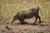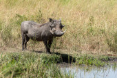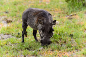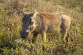 Zwykły guziec stoi i obserwuje kamerę w długiej trawie