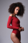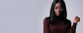 Portret pięknej, inteligentnej afrykańskiej modelki odizolowanej na szarym tle.