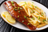 Grillowane żeberka podawane z frytkami z bliska na talerzu.