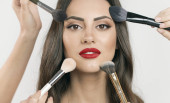 Młoda piękność delikatnie za pomocą pędzla do makijażu