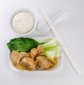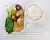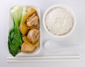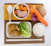 kurczak z ryżem i warzywami w tle