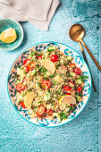 Zdjęcie "Sałatka stołowa bulwy, pomidory, przyprawy, koperek na niebieskim tle. Tradycyjna kuchnia orientalna." może być wykorzystywane do celów osobistych i komercyjnych zgodnie z warunkami zakupionej licencji Royalty-free. Obraz jest dostępny do pobrania w jakości wysokiej rozdzielczości do 5760x3840.