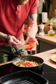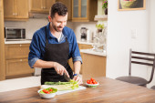 Zdjęcie "Młody uśmiechnięty mężczyzna stojący przy stole kuchennym i krojący warzywa na desce do krojenia sałatek w kuchni domowej" może być wykorzystywane do celów osobistych i komercyjnych zgodnie z warunkami zakupionej licencji Royalty-free. Obraz jest dostępny do pobrania w jakości wysokiej rozdzielczości do 5760x3840.