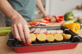 Młody uśmiechnięty mężczyzna stojący przy stole kuchennym i krojący warzywa na desce do krojenia sałatek w kuchni domowej