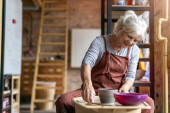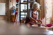 Starsza kobieta wykonująca ceramiczną pracę z kołem garncarskim