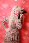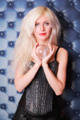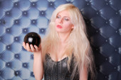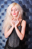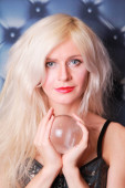 magia młoda kobieta trzyma dużą kryształową kulę i chce poznać przyszłość miłości na czerwonym tle studio