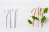 ekologiczne naturalne kubki papieru, słomki, drewniane sztućce płaskie leżały na szarym tle. koncepcja zrównoważonego stylu życia. zero odpadów, plastikowe przedmioty. zatrzymać zanieczyszczenie plastiku. Widok z góry, nad głową, szablon, Mockup.