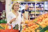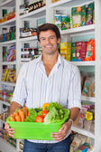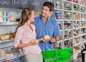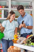 mężczyzna klienta z ekspedientka porównanie dojrzałe w supermarke