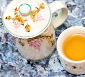 garnek i filiżankę herbaty z jaśminu na drewniane tła