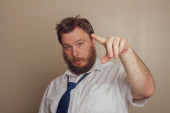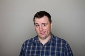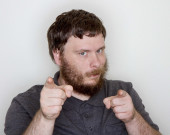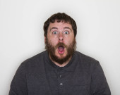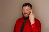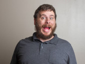 Duży uśmiech na mężczyźnie, ale można powiedzieć, że jest fałszywy.