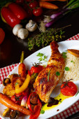 Zdjęcie "Kuchnia indyjska: pieczony kurczak z ryżem i warzywami. " może być wykorzystywane do celów osobistych i komercyjnych zgodnie z warunkami zakupionej licencji Royalty-free. Obraz jest dostępny do pobrania w jakości wysokiej rozdzielczości do 5760x3840.