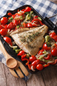 Pieczony karp z ziemniakami, cukinią, brokułami i pieprzem z bliska