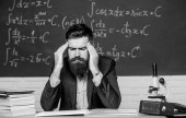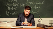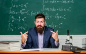 Szkoła hipsterska. Hipsterski nauczyciel. Hipster w klasie. Brodaty mężczyzna w formalnym stroju przy stole nauczycielskim. Brutalny człowiek w hipsterskim stylu w szkole lub na uniwersytecie