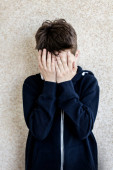 Smutna nastolatka na ciemnym tle, zbliżenie