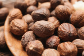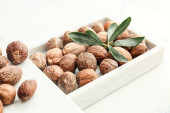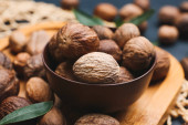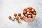 Miska ze smacznymi orzechami makadamia na tle koloru