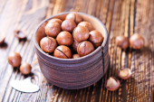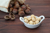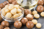 Smaczne orzechy makadamia z olejem na drewnianym tle
