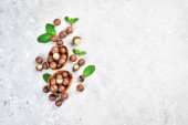 Smaczne orzechy makadamia z olejem na drewnianym tle