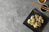 Talerz ze smacznymi japońskimi sosami gyoza na białym tle