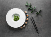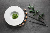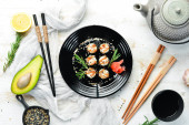 Talerz ze smaczną japońską gyozą i sosem na białym tle