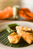 Płyta ze smaczną japońską gyozą i sosem na stole, zbliżenie