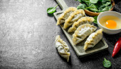 Talerze ze smaczną japońską gyozą i sosem na drewnianym stole
