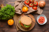 Deska ze smacznymi kanapkami croissant na drewnianym stole