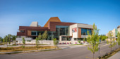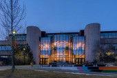 Calgary, Alberta - 16 listopada 2019: Fasada nowoczesnego budynku na kampusie Uniwersytetu w Calgary. Uniwersytet w Calgary przeszedł znaczną rozbudowę dzięki wielu nowym budynkom..