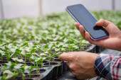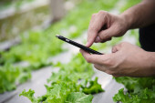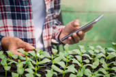 Gospodarz pracujący w ogrodzie sałaty organicznej - inteligentni rolnicy w ekologicznej koncepcji rolnictwa ekologicznego