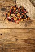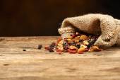 czarne rodzynki w płótnie torby na drewnianym stole