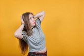 Śliczna młoda kobieta dziwnie wyglądająca, myśląca o problemach, cierpiąca na ból głowy