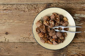 Złoty rodzynki w płótnie torby na drewnianym stole