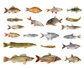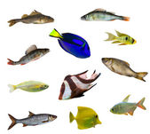 Zestaw ozdobne ryby słodkowodne na białym tle. takich jak leopoldi Angelfish, Coral Red Pencilfish, niemiecki ram Cichlid, Serpae Tetra, Green Neon Tetra i Rainbowfish etc.