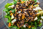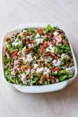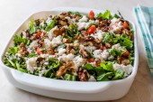 Domowej roboty Arugula Rucola / Liście Rakiety Sałatka z kulkami serowymi, orzech włoski, Black Cumin Nasiona i pomidory wiśniowe. Żywność ekologiczna świeża.