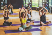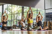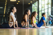"Grupa różnorodności praktykujących zajęcia jogi, zdrowe lub medytacja Ćwiczenia, rozciąganie w górę twarz psa ćwiczenia, noszenie biustonosz sportowy i spodnie, sport i koncepcja opieki zdrowotnej