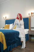 czerwony głowa młoda kobieta w beżowy i czarny bielizna pozowanie na niebieski łóżko w jej sypialni