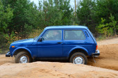 Dziki na kole Rosyjski samochód Suv w jesiennym lesie na wyścigach