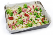 Kontekst warzyw, kiełbasy siekanej i krewetek przygotowanych do pieczenia