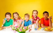 Grupa dzieci chłopca i dziewczyny gospodarstwa świeże pomidory dojrzałe