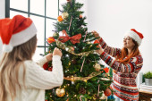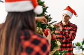 Młoda piękna para uśmiechnięta szczęśliwa i pewna siebie. Stojący i dekorowanie choinki w domu