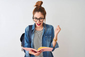 Rudowłosa studentka nosząca plecak czytająca książkę na białym tle zirytowana i sfrustrowana wrzaskami gniewu, szaleństwa i wrzasków z podniesionymi rękami, koncepcja gniewu