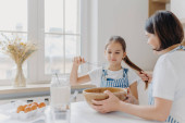 Zdjęcie "Mała słodka dziewczyna w fartuchu, miesza składniki, whisky z trzepaczką, używa jaj, mleka, mąki, próbuje nowego przepisu, stoi przeciwko wnętrzu kuchni, przygotowuje smaczne ciasteczka lub piekarni, uczy się gotować." może być wykorzystywane do celów osobistych i komercyjnych zgodnie z warunkami zakupionej licencji Royalty-free. Obraz jest dostępny do pobrania w jakości wysokiej rozdzielczości do 5760x3840.