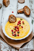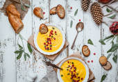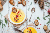 zupa z dyni z pieczywem tostowym, nasiona granatu i przyprawy na nieczystym białym tle z szyszkami, tkaniny i zioła, widok z góry