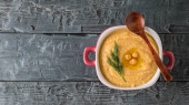zupa z dyni z pieczywem tostowym, nasiona granatu i przyprawy na nieczystym białym tle z szyszkami, tkaniny i zioła, widok z góry
