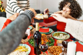 Piękna grupa ludzi spotyka uśmiechniętych szczęśliwych i pewnych siebie. Jedzenie pieczonego indyka i tosty z filiżanką wina świętując Święto Dziękczynienia w domu