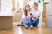Piękna para siedzi na podłodze trzymając smartfona w nowym domu wokół kartonowych pudełek zirytowany i sfrustrowany krzycząc z gniewu, szalony i krzycząc z podniesioną ręką, koncepcja złości